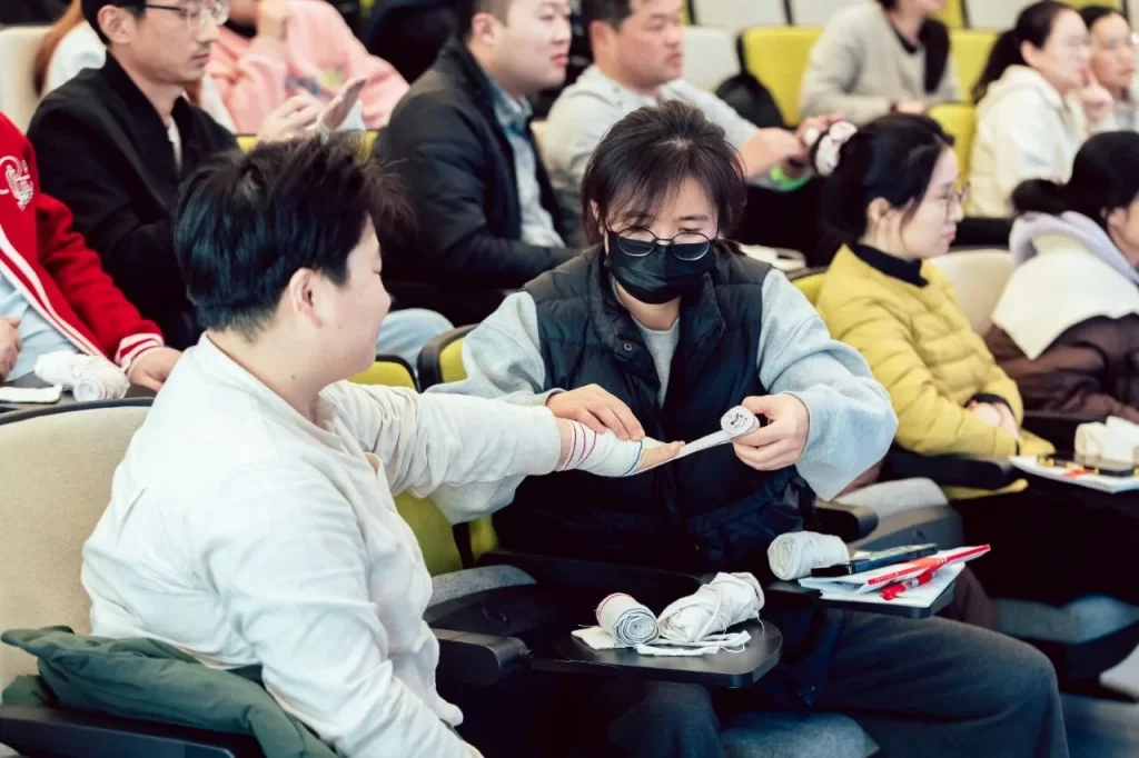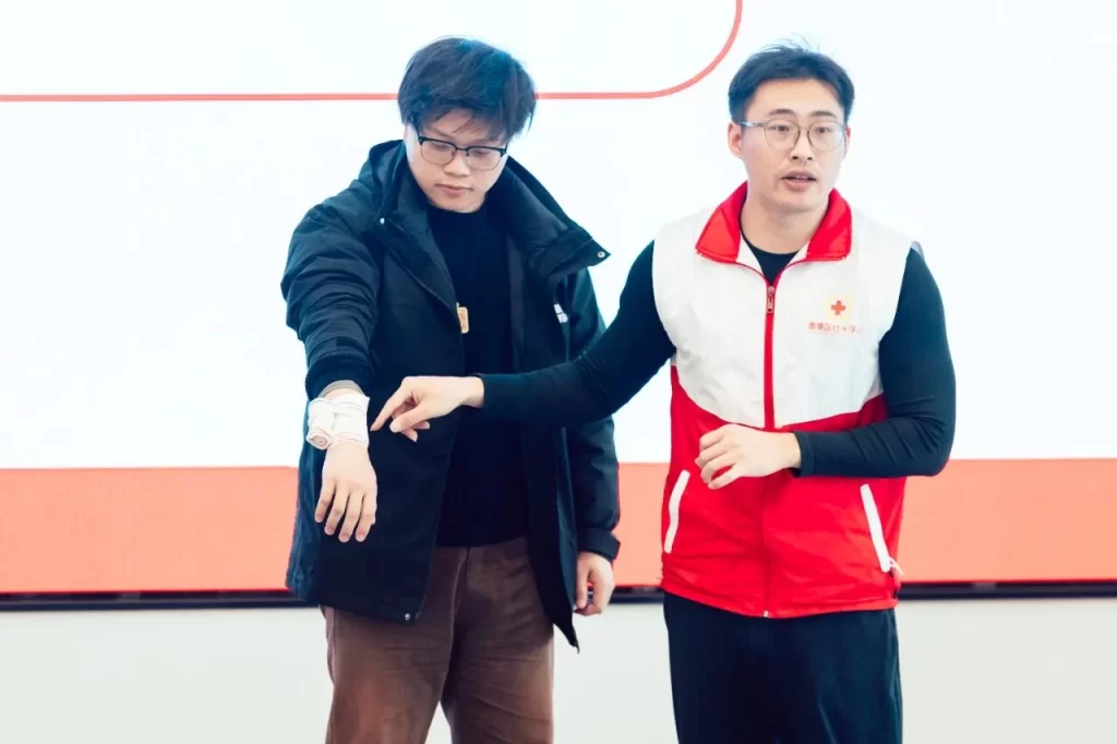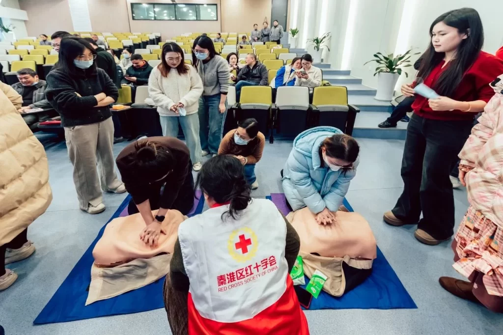 本次培训的主要内容包括心肺复苏操作(CPR)及自动体外除颤仪(AED)的使用、气道异物梗阻处置、创伤救护技术(含止血、包扎、固定等)。秦淮区红十字会专业培训讲师结合真实案例,生动讲解了心搏骤停的突发性与“黄金救援4分钟”的重要性,并通过现场演示及指导,帮助受训员工掌握心肺复苏、AED使用、创伤救护的技术。